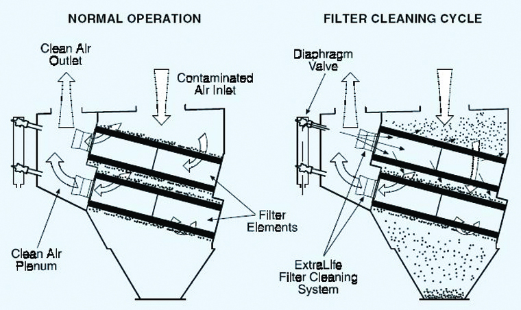 2、煙塵在風(fēng)機風(fēng)動力作用下,經(jīng)過抽風(fēng)管道,進(jìn)入濾筒表面。由于氣流截面突然擴大及氣流分布板的作用,風(fēng)速驟降,氣流中一部分粗大顆粒在風(fēng)動力和慣性力的作用下相互碰撞,自然沉降到底部集灰斗;粒度細(xì)、密度小的塵粒,通過擴散和篩濾等組合效應(yīng),沉積在濾筒濾料的外表面上而被攔截。